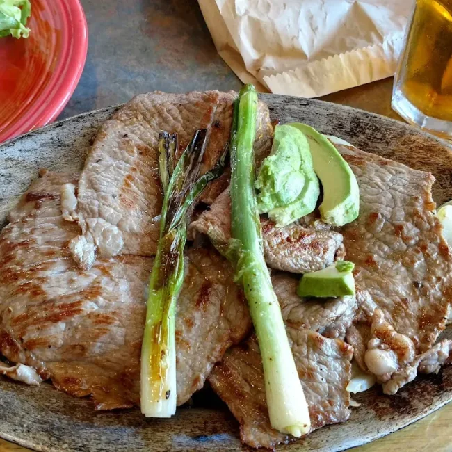Thin slices of steak prepared to order with grilled onions, garnished with avocado slices, green onions; served with beans, rice, salad, and tortillas. .