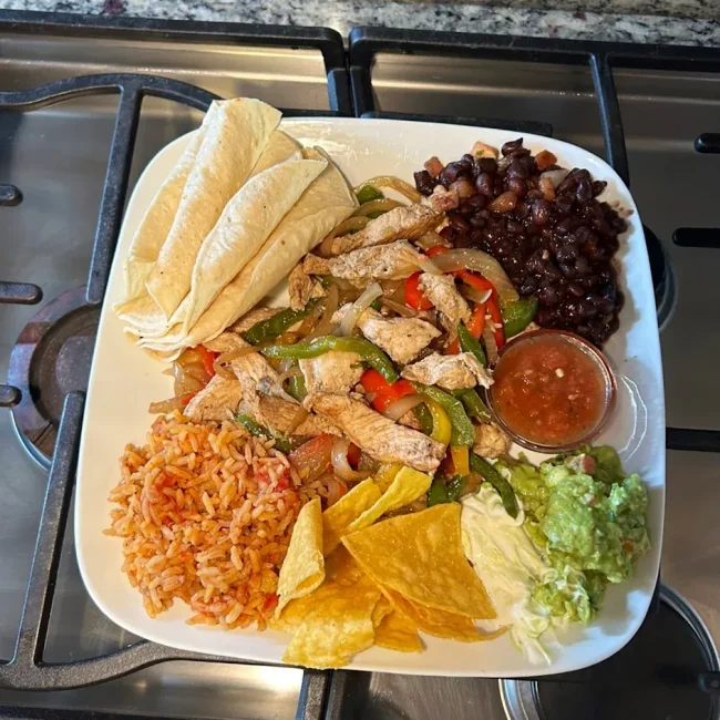Comes with chicken, steak and shrimp, prepared with onions, green and red peppers; served with pico de gallo on black beans, rice, guacamole, sour cream and tortillas.