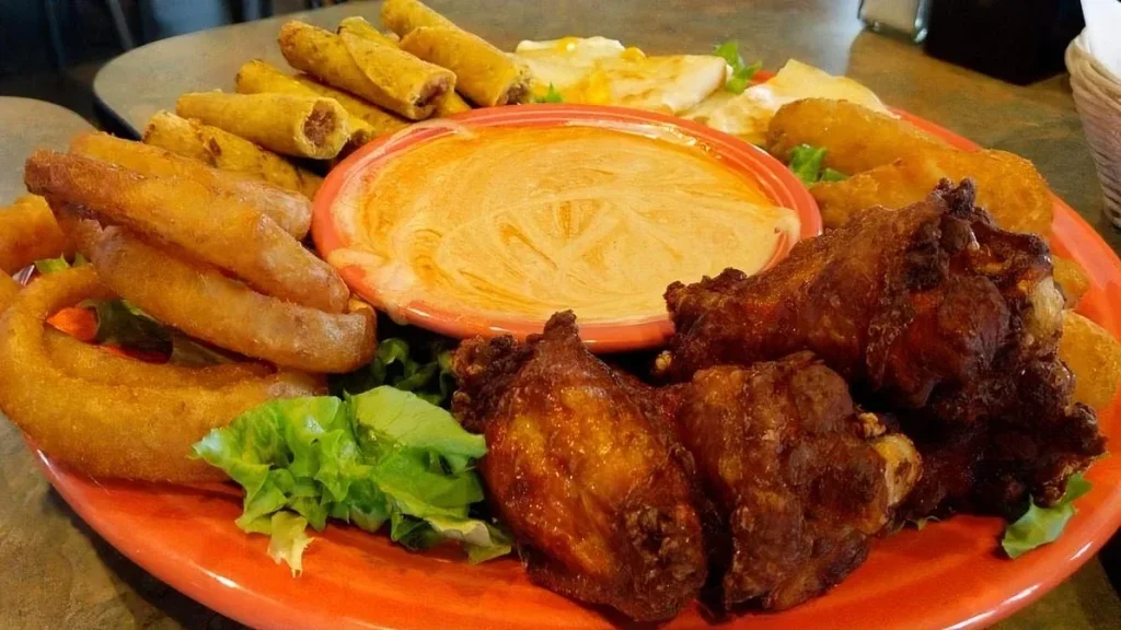 Our appetizer plater featuring hot and spicy buffalo wings, taquitos, cheese quesadilla, jalapeno peppers, and onion rings; served with VIENTOS dipping sauce.