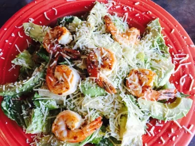 Avocado and succulent shrimp on a bed of lettuce with VIENTOS Caesar dressing, croutons, and shredded parmesan.