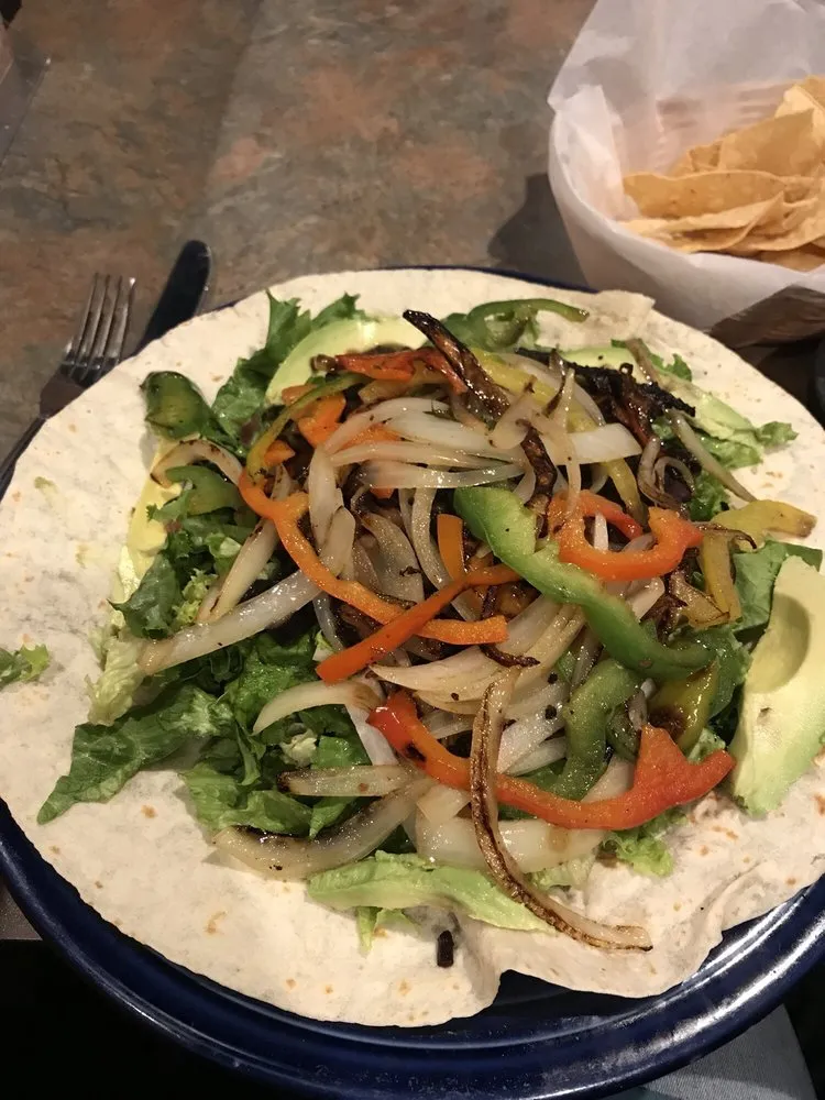 Chicken, beef or carnitas on a large soft flour tortilla, tossed greens, with a honey Dijon vinaigrette dressing; served with jicama, tomatoes, olives and avocado slices.